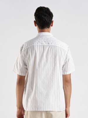 Product Details  White opaque casual shirt for men Spread collar Button placket Straight hemline Vertical stripes Striped Regular length Short