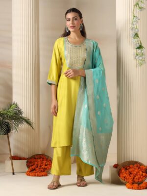 Women Liva Lemon Yellow Embroidered Kurta Comfort Pant Jacquard Dupatta