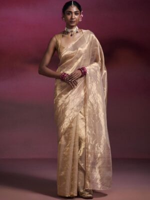 Dressfolk Chanderi Tissue Saree in Light Gold with Gold Border