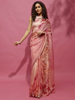 ODETTE Odette Mustard And Pink Satin Lace Work Saree With Unstitched Blouse For Women