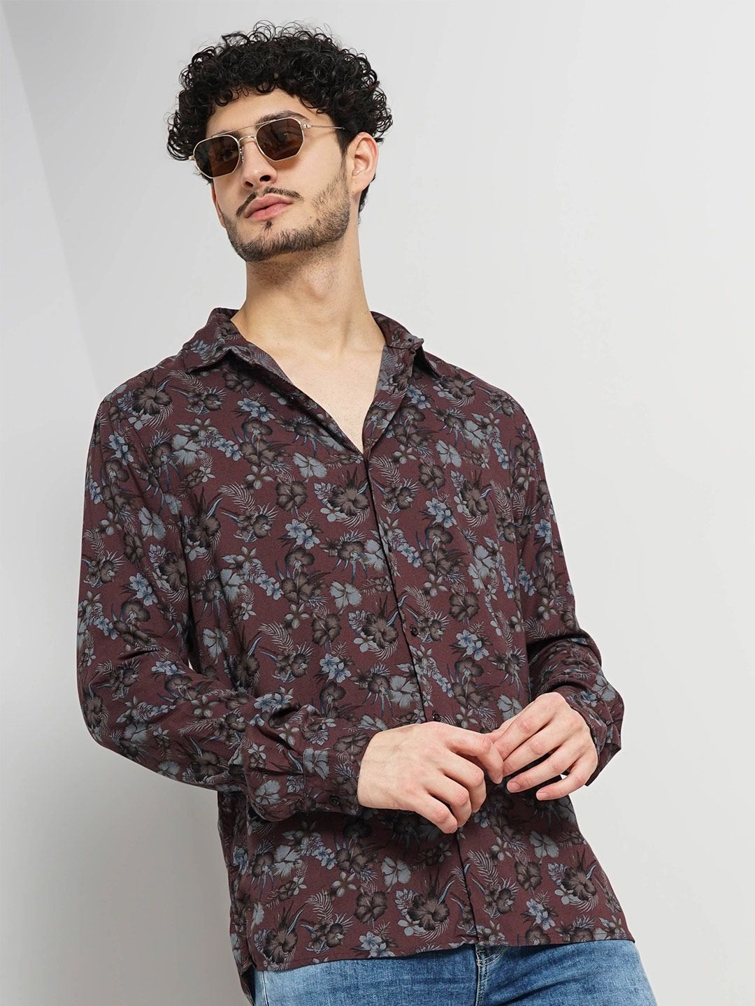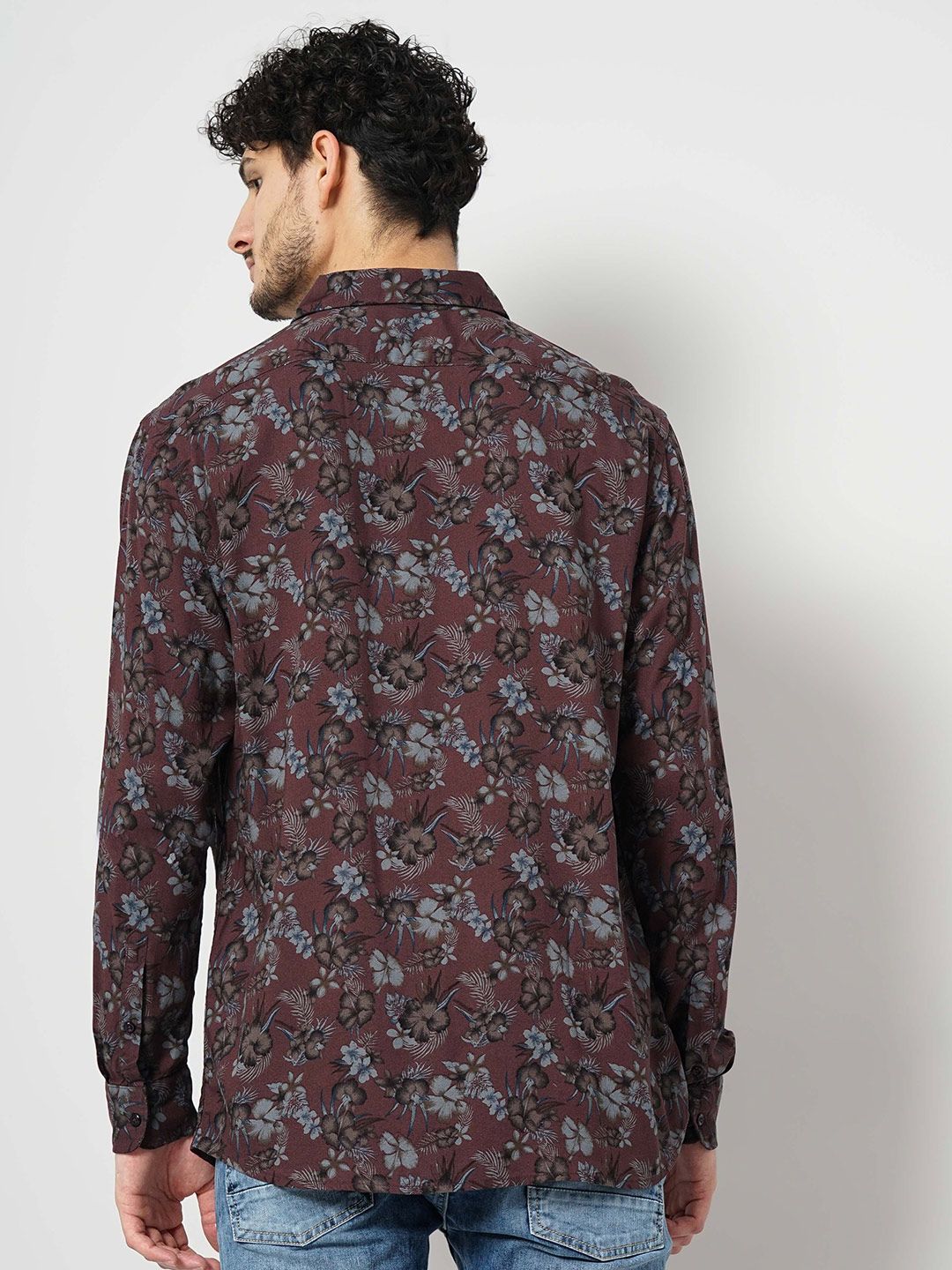 Burgundy & blue floral printed opaque casual shirt, has a spread collar, button placket, long regular sleeves, straight hem