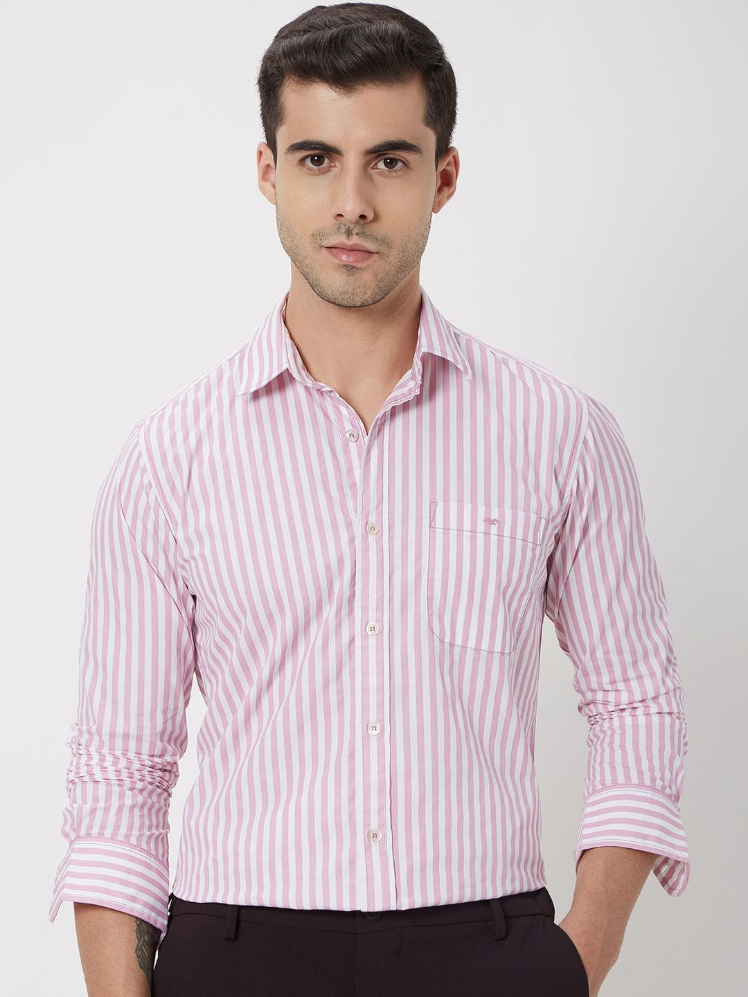 Pink & white vertical stripes striped opaque Casual shirt ,has a spread collar, button placket, 1 patch pocket, long regular sleeves, curved hem
