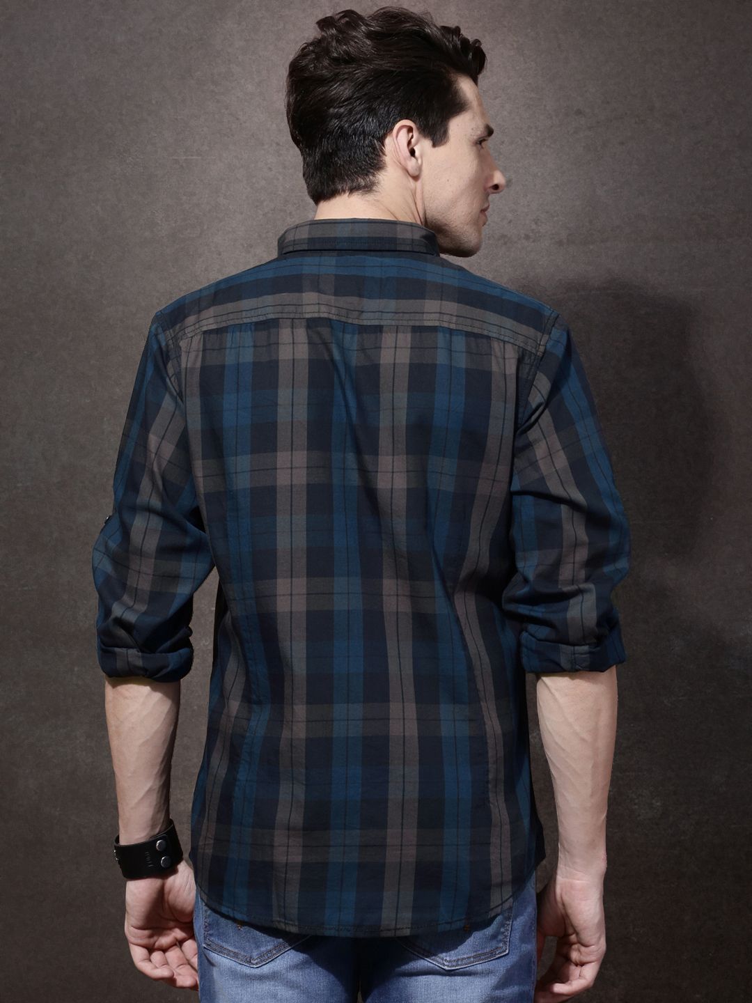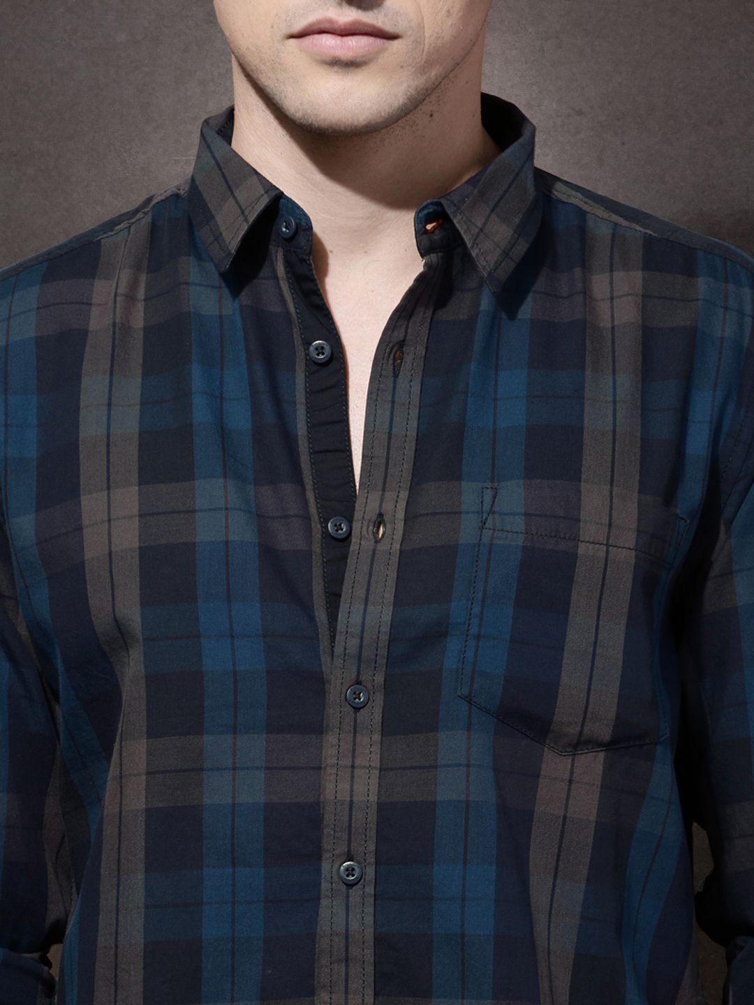 Navy blue and grey checked casual shirt, has a spread collar, button placket, long sleeves with roll-up tabs, a chest pocket, curved hem