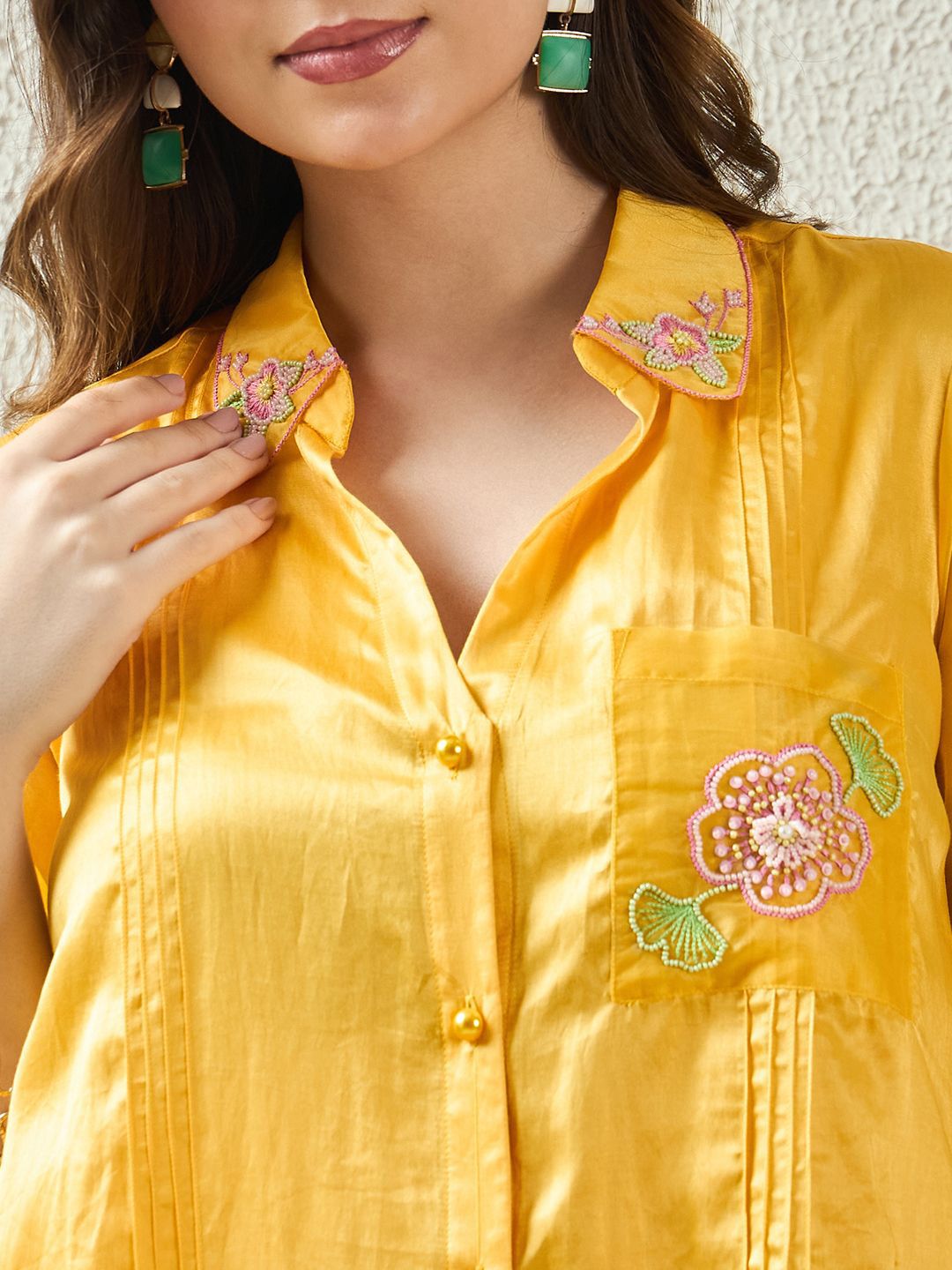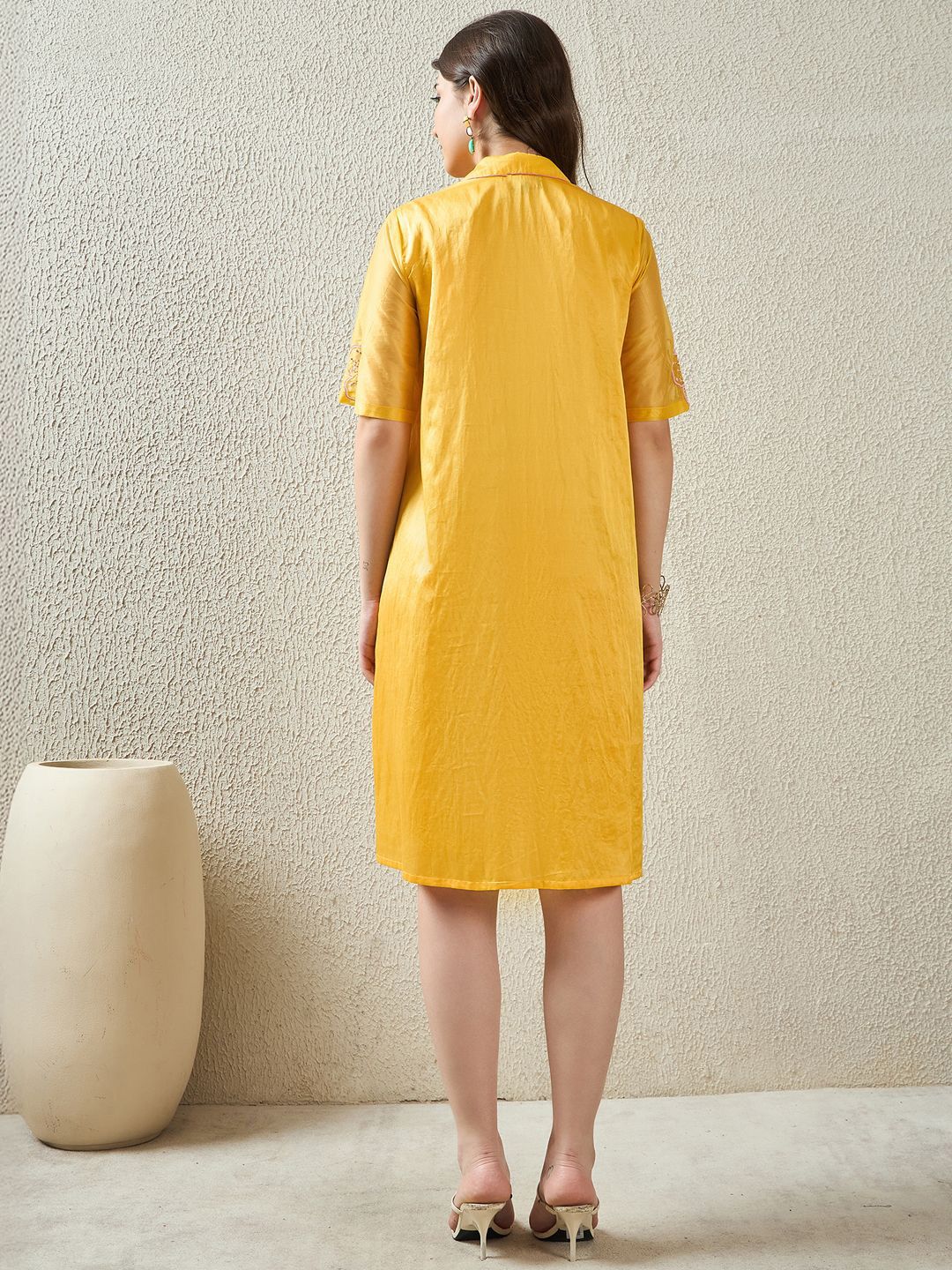 - Yellow and yellow floral embroidered shirt dress