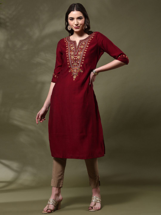 Embroidered Calf Length V-Neck Three-Quarter Sleeve Straight Kurta